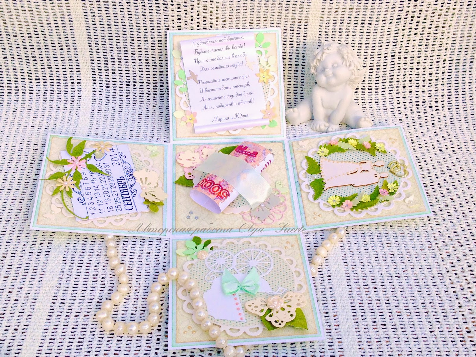 ОтветитьУдалитьНежность какая!!! Олечка, детали потрясающие!! И голуби, и вырубка, и цветочные веночки - все просто прелесть!)) И ангелочек такой душка!!))